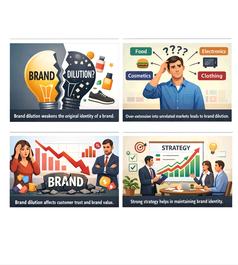 Brand dilution occurs when a brand loses its original identity and value due to over-extension. Although expansion can support business growth, excessive expansion may confuse customers and weaken the brand image.
